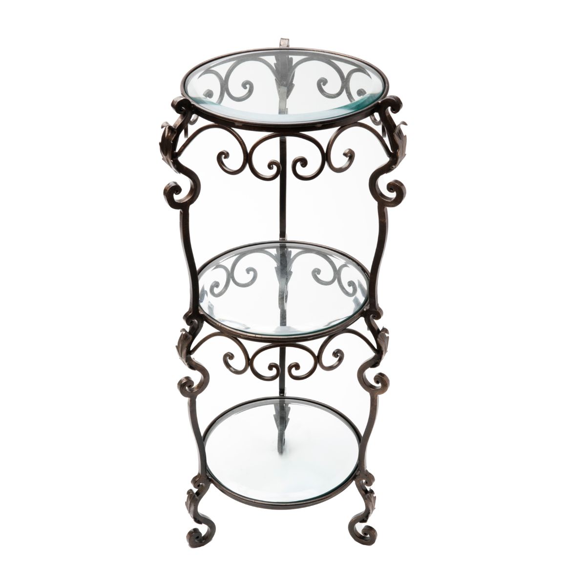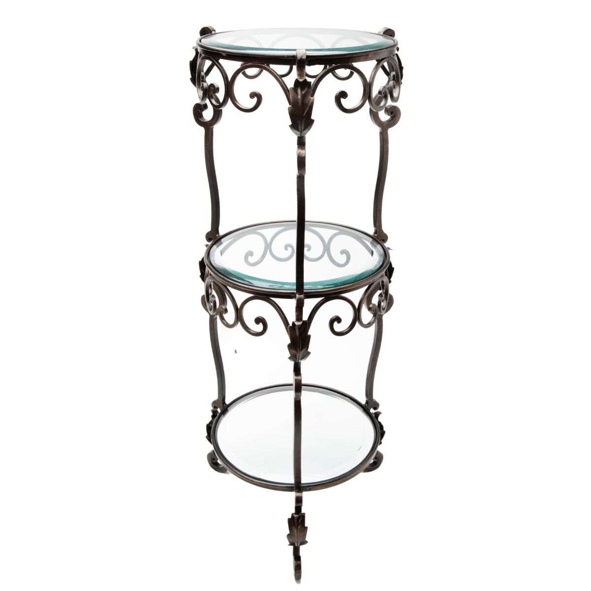 Both decorative and functional, this lovely three-tier Acanthus Leaf Table will be a beautiful accent piece anywhere in your home. Its three beveled glass shelves are a perfect place for a small lamp, floral display, favorite ornamental objects, or set of books. Measures 12.5 inches in diameter x 34 inches high.