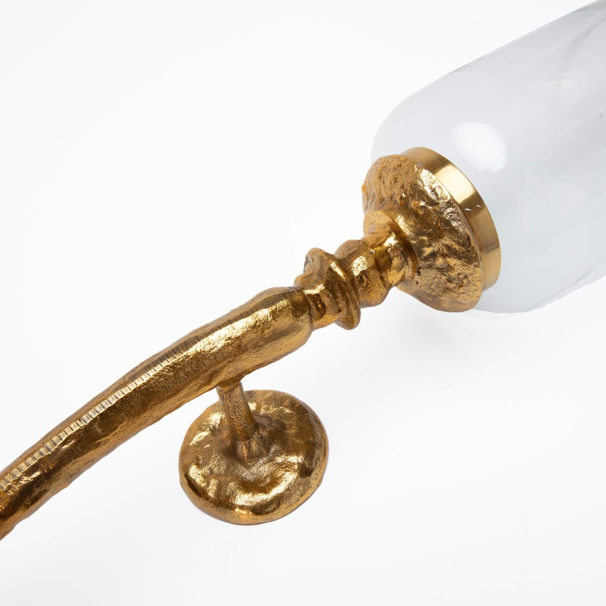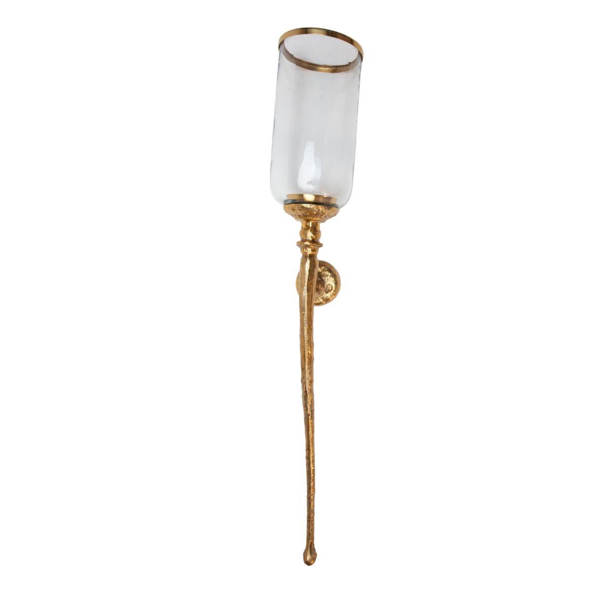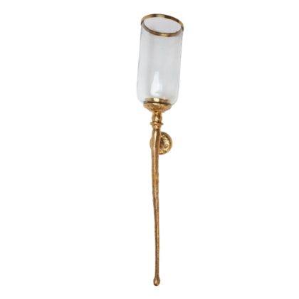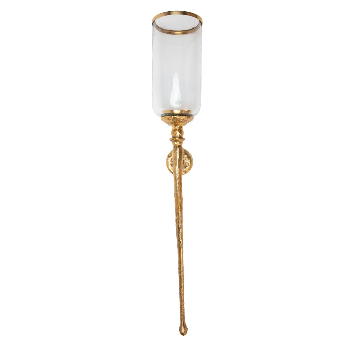 Add style to your decor with this fabulous candle wall sconce in hammered gold finish. With its clear glass shade and gracefully curved arm, this beautiful sconce will make a statement anywhere you place it in your home. Use two to frame a large mirror elegantly, or place wherever you want to add a lovely eye-catching decorative element. Measures 6 inches round by 42 inches long.