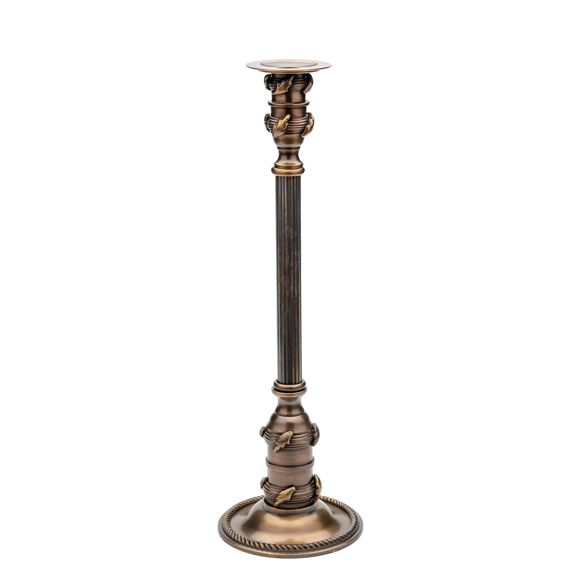 Add a lovely design element to your decor with this beautiful Antique Brass Leaf Candleholder. Its classic style lends an elegant look to a dinner table, buffet or sideboard. Beautiful used alone or in pairs, or in an arrangement with the available smaller 12-inch size. Holds a taper candle (not included). Measures 4.5 inches in diameter x 14 inches high.