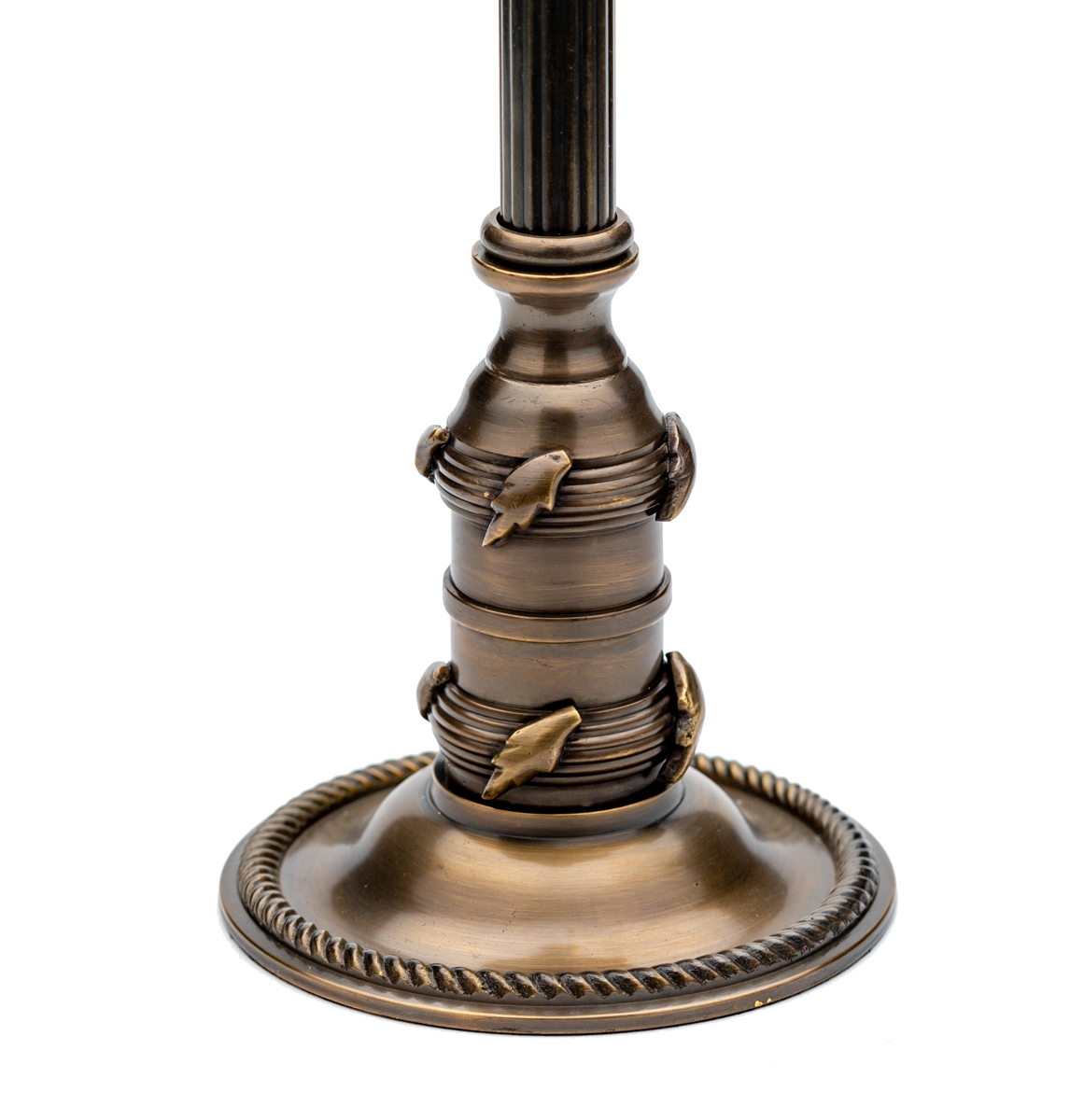 Add a lovely design element to your decor with this beautiful Antique Brass Leaf Candleholder. Its classic style lends an elegant look to a dinner table, buffet or sideboard. Beautiful used alone or in pairs, or in an arrangement with the available smaller 12-inch size. Holds a taper candle (not included). Measures 4.5 inches in diameter x 14 inches high.