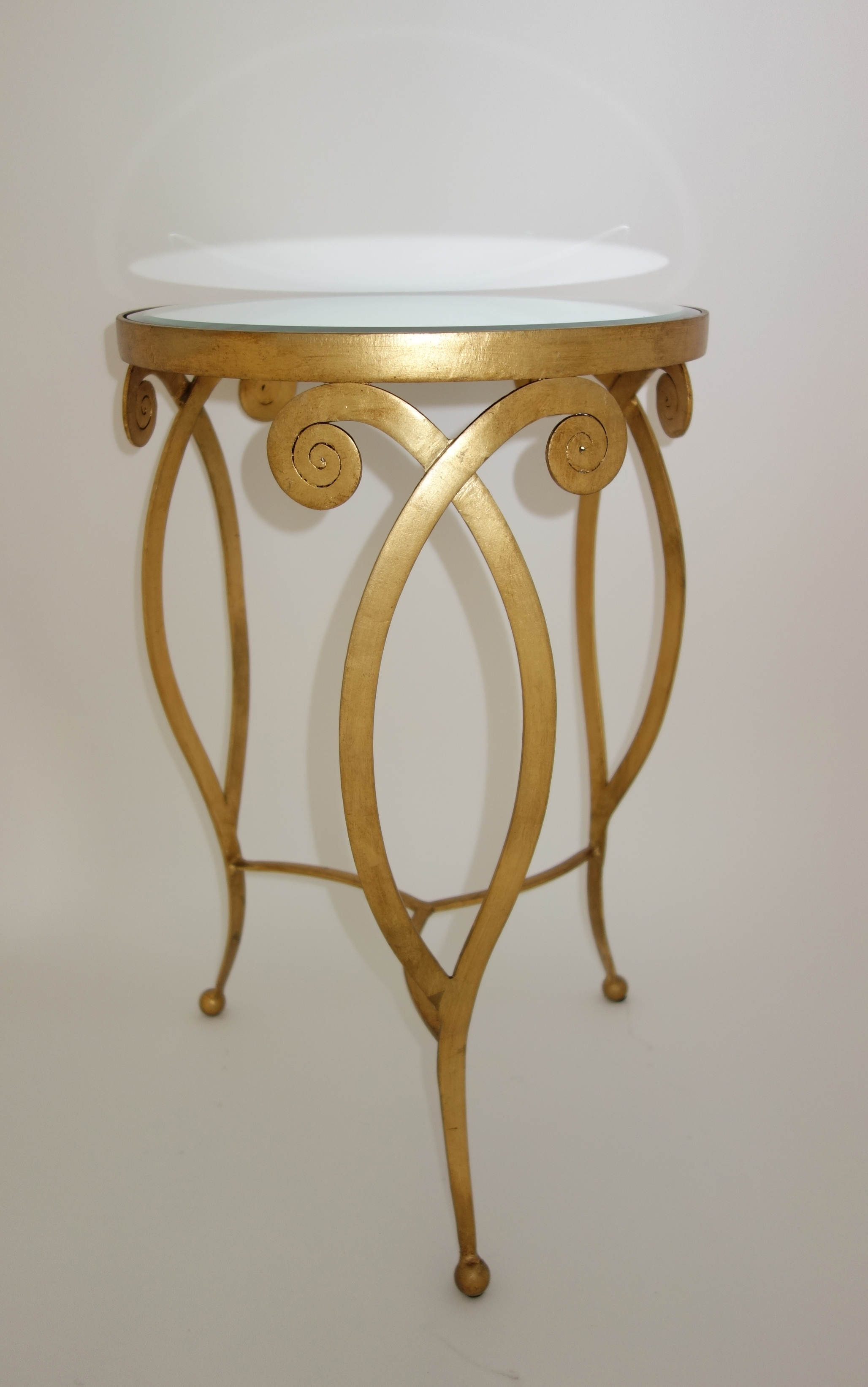 Both decorative and functional, this fabulous table has a sophisticated art deco style. With a beveled mirror top and a beautiful antique gold color frame, it makes a distinctive ornamental accent that's perfect for holding a lamp or floral arrangement, or displaying a favorite object. Measures 25 inches high x 15 inches in diameter.