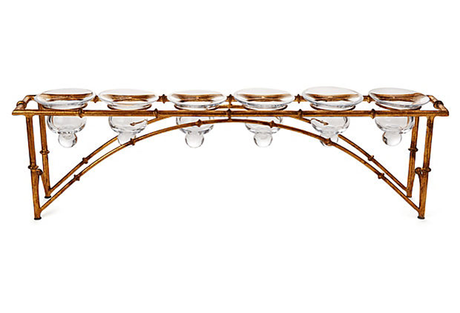 Create a warm, inviting atmosphere in your home with this Asian-inspired bamboo-look votive bridge candleholder. Finished in an antique gold color, it holds six votive candles in its beautiful glass holders, and looks lovely on a mantelpiece or table. Makes a striking addition to your decor. Includes bridge and six glass candleholders. Candles not included. Measures 24 inches long x 6.5 inches high x 3.5 inches deep.