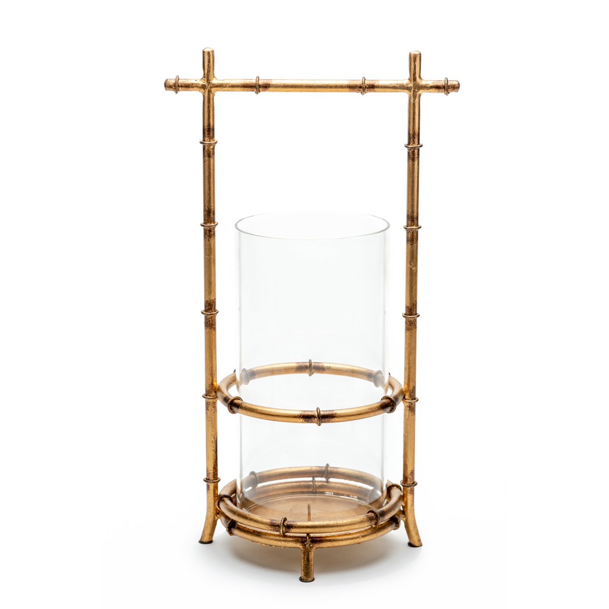 Create a warm, inviting atmosphere in your home with this Asian-inspired Bamboo Hurricane Candleholder. Finished in an antique gold color, it looks lovely on a mantelpiece, buffet or table. Holds a 3" pillar candle (candle not included). Measures 19.5 inches high x 11 inches wide x 8.5 inches deep.
