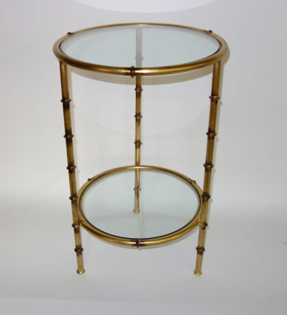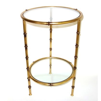 Both decorative and functional, this lovely round Antique Gold Iron Bamboo Table will be a beautiful accent in any home. With its clear glass top and shelf and bamboo-styled frame, it makes a perfect place to show off a beautiful flower-filled vase or display a favorite ornamental object. Its Asian-inspired design is at home with any decor style. Measures 24.5 inches high x 15.5 inches in diameter.