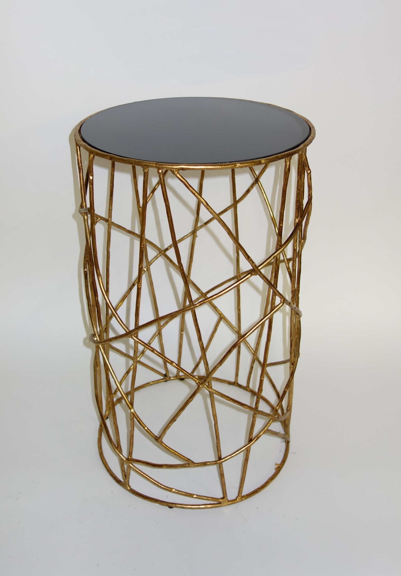This beautiful accent table with its lovely antique gold color twig-style frame and black glass top makes a fabulous design element that is both decorative and functional. This gorgeous piece lends an elegant and airy feel to any room. Top with a lamp, decorative jar or framed photos, or place your wine glass or coffee cup within reach while relaxing in your favorite armchair. Measures 24 inches high x 14 inches in diameter.