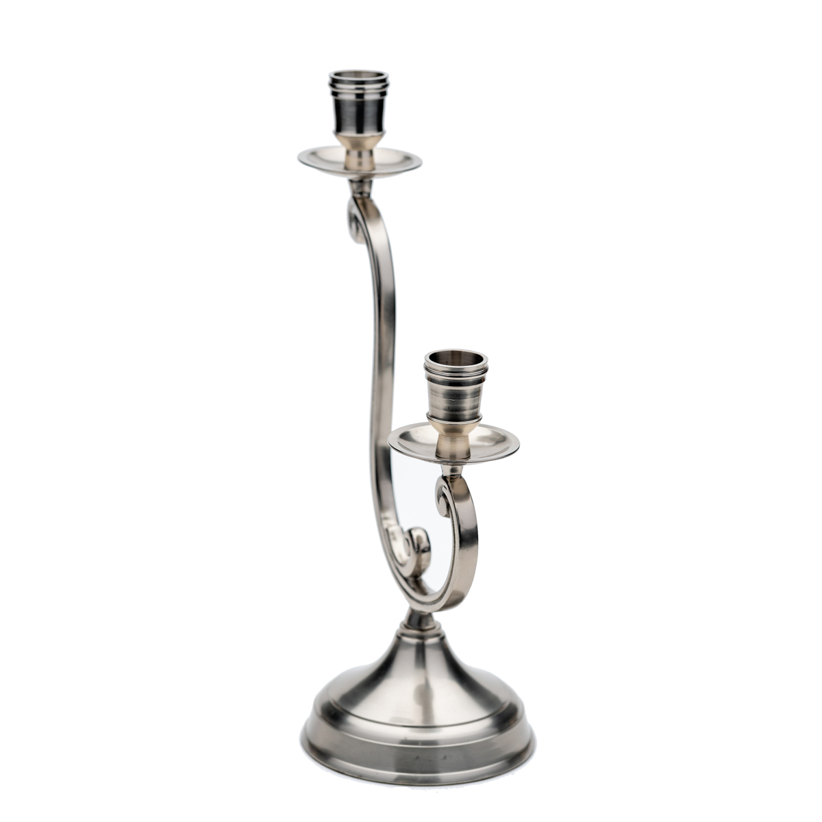 This beautiful Two Light Candleholder evokes the style of those found in elegant 18th century homes. Brass with an antique silver finish, it makes a lovely addition to a dining or side table, or place a pair on either side of your mantelpiece to create a warm ambiance. Measures: 4.25 inches x 7 inches x 12 inches.