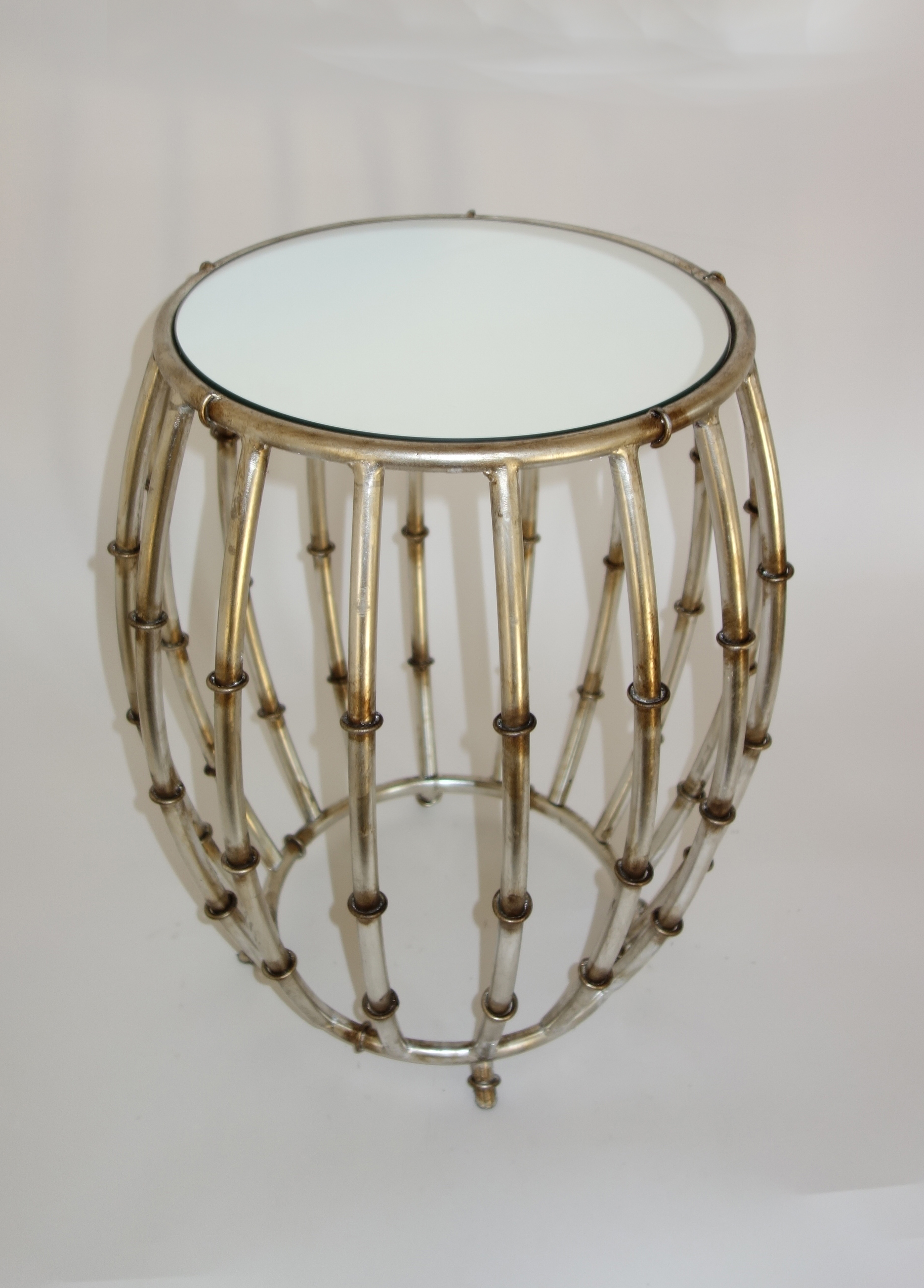 This lovely Asian-Inspired Antique Silver Bamboo Drum Table adds a beautiful design element that is both decorative and functional. With its mirrored glass top and bamboo-styled frame, it will lend an elegant and airy feel to your living space. Top with a lamp, decorative jar or framed photos, or place your wine glass or coffee cup within reach while relaxing in your favorite armchair. Measures 22 inches high x 19 inches in diameter.