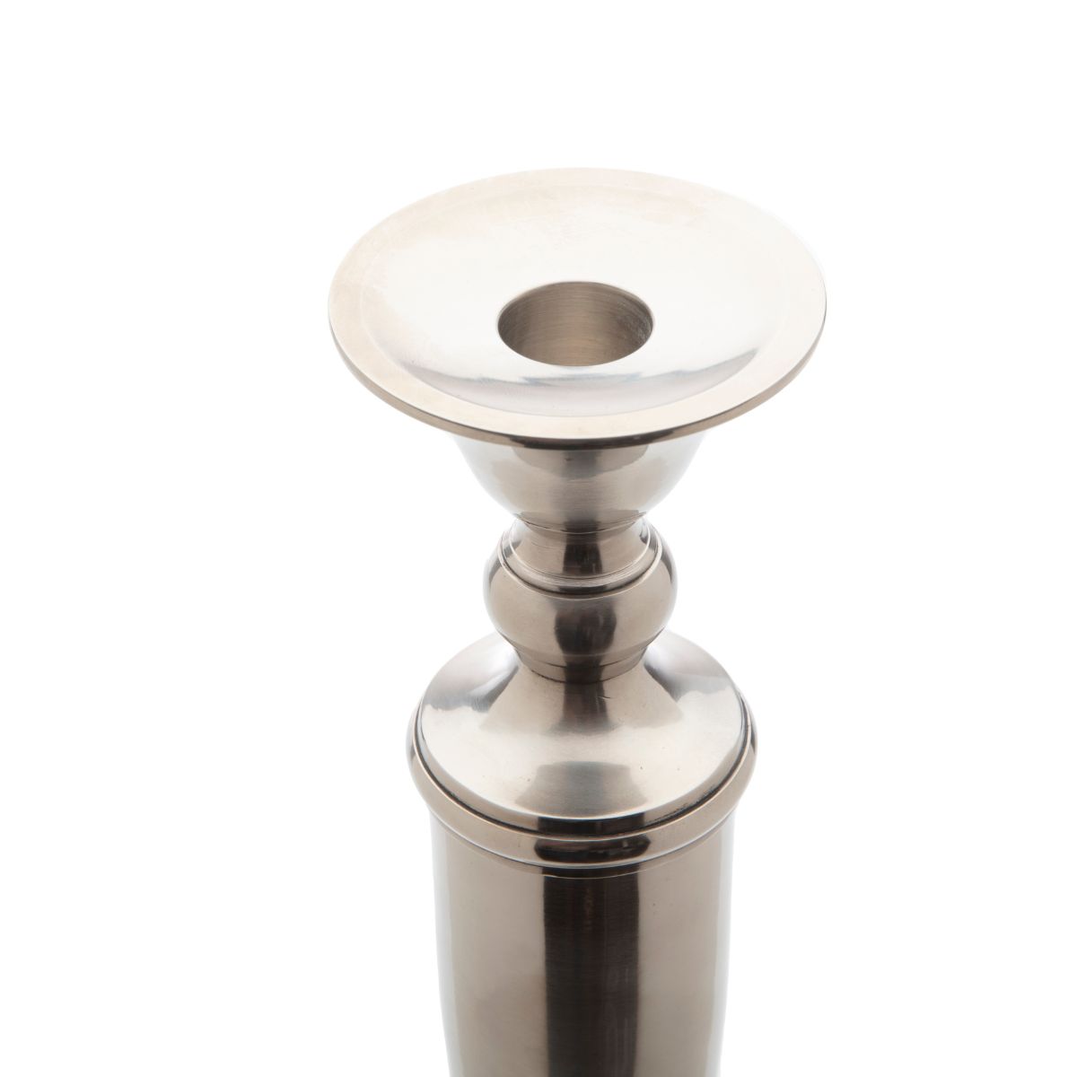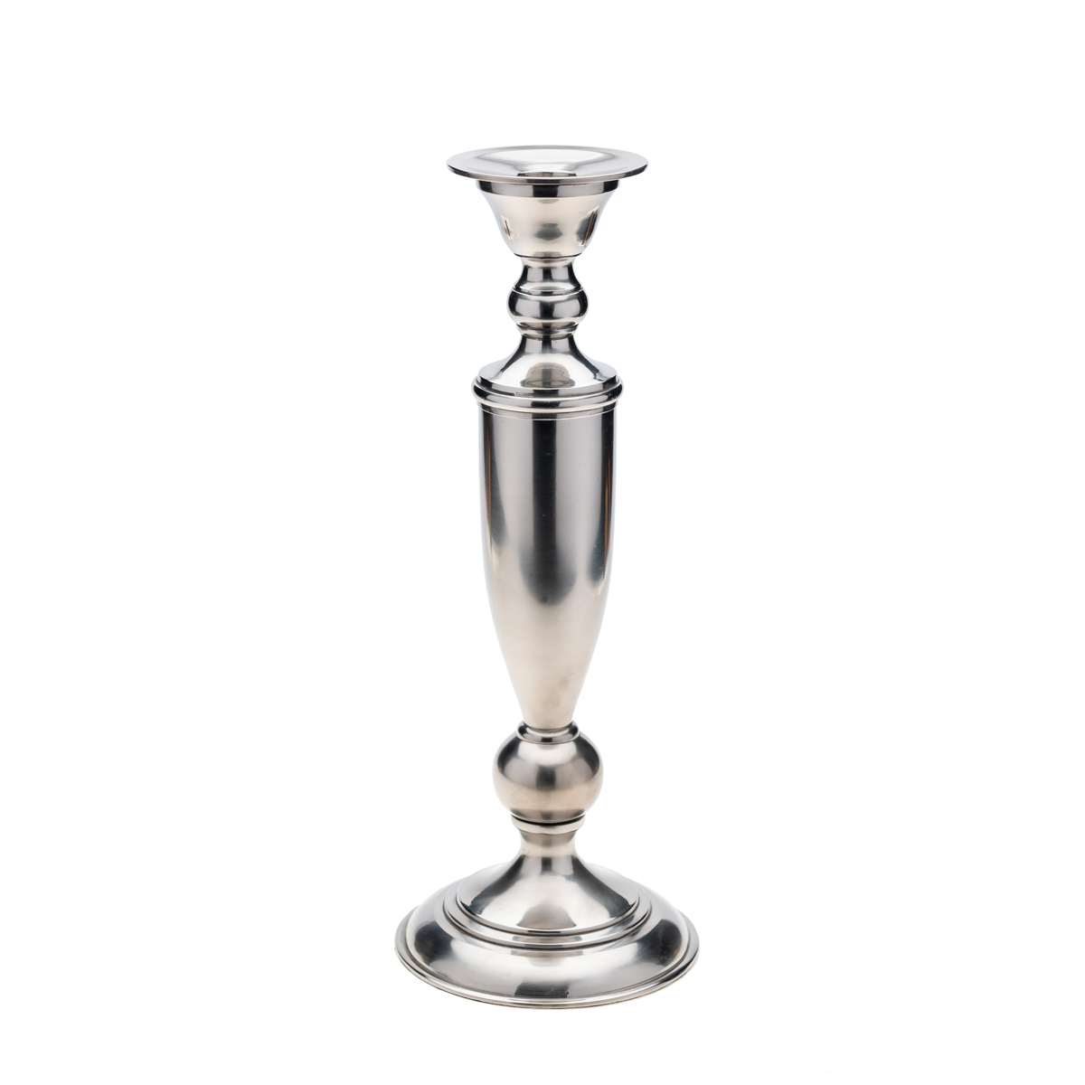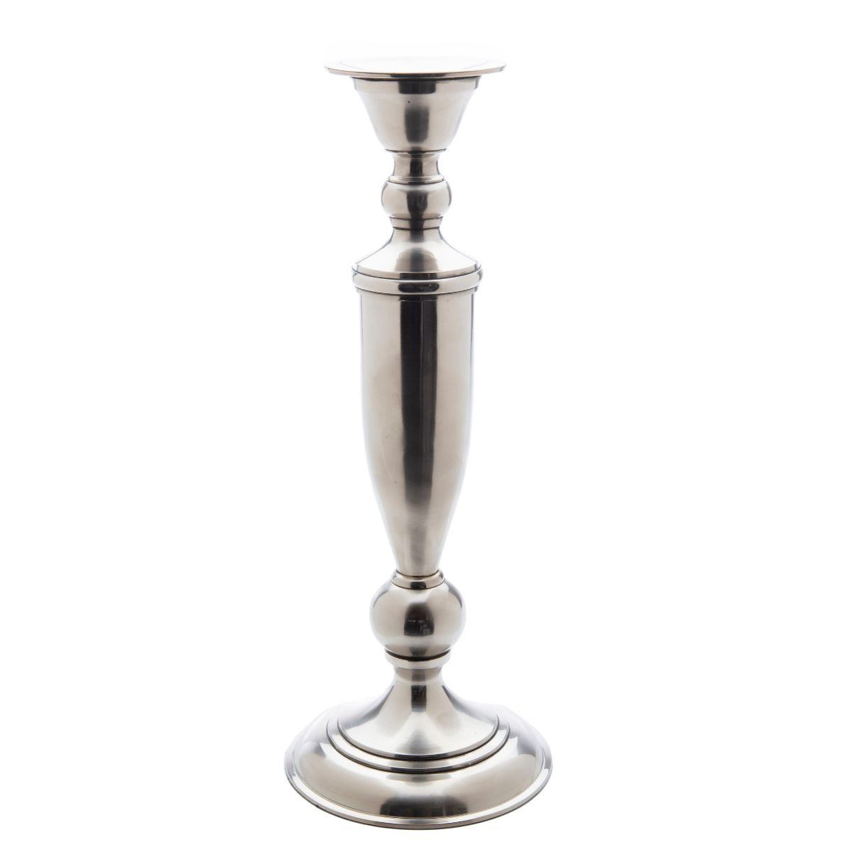 Add a lovely design element to your decor with this beautiful Antique Silver Candleholder. Its graceful style lends an elegant look to a dinner table, buffet or side table. Sold as single candleholder. Candle not included. Measures 4.5 inches wide x 12 inches high.***SOLD AS ONE EACH