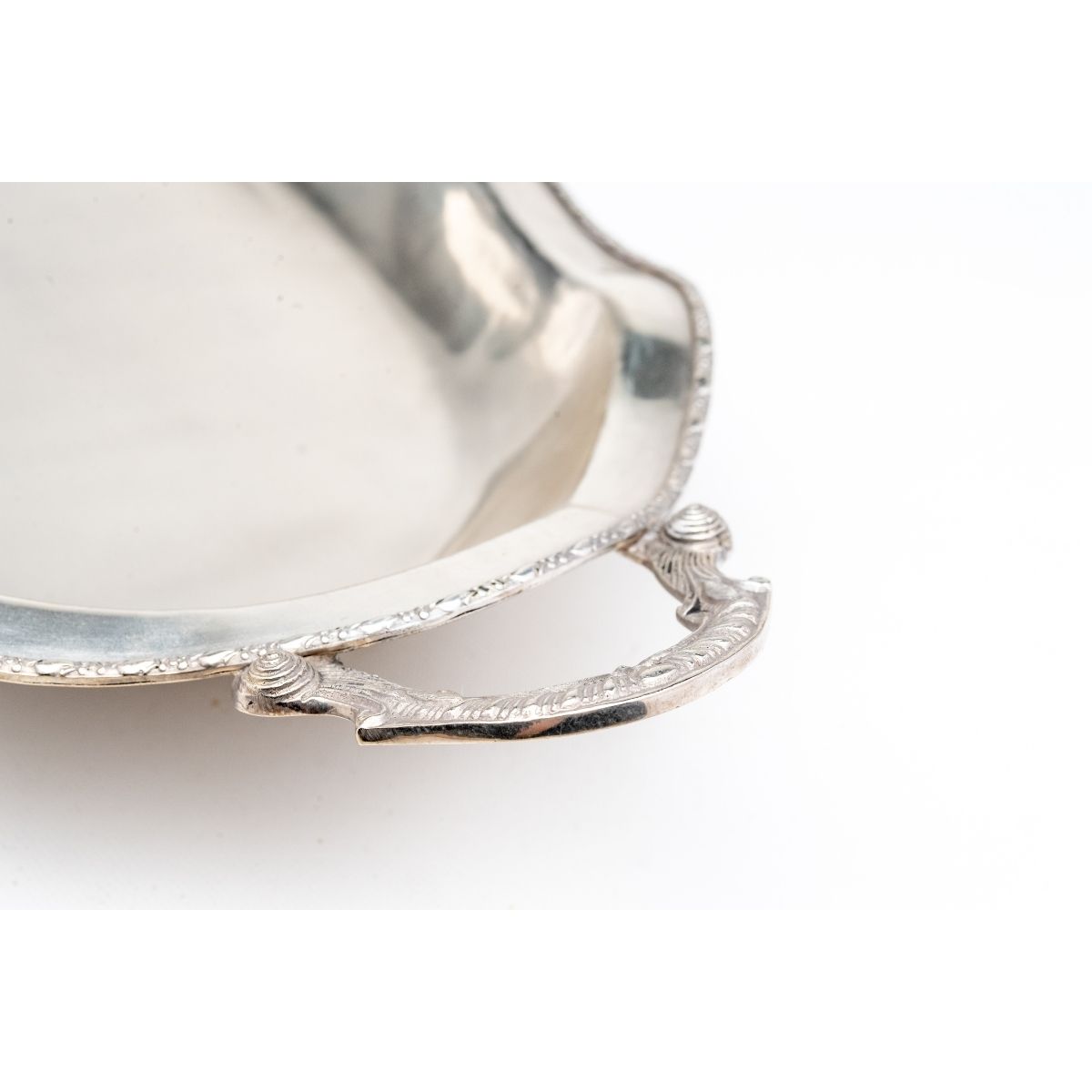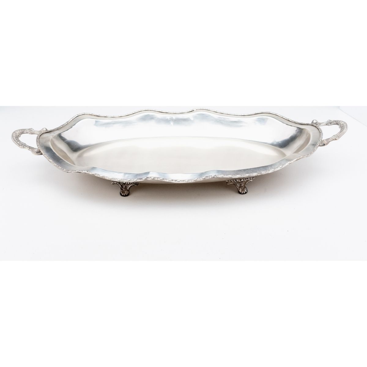 This gorgeous Antique Silver Oval Footed Tray with its scalloped edges and lovely detail will make a fabulous centerpiece on your dining table or sideboard. Measures 25.75 inches wide x 11.5 inches long x 3 inches high.