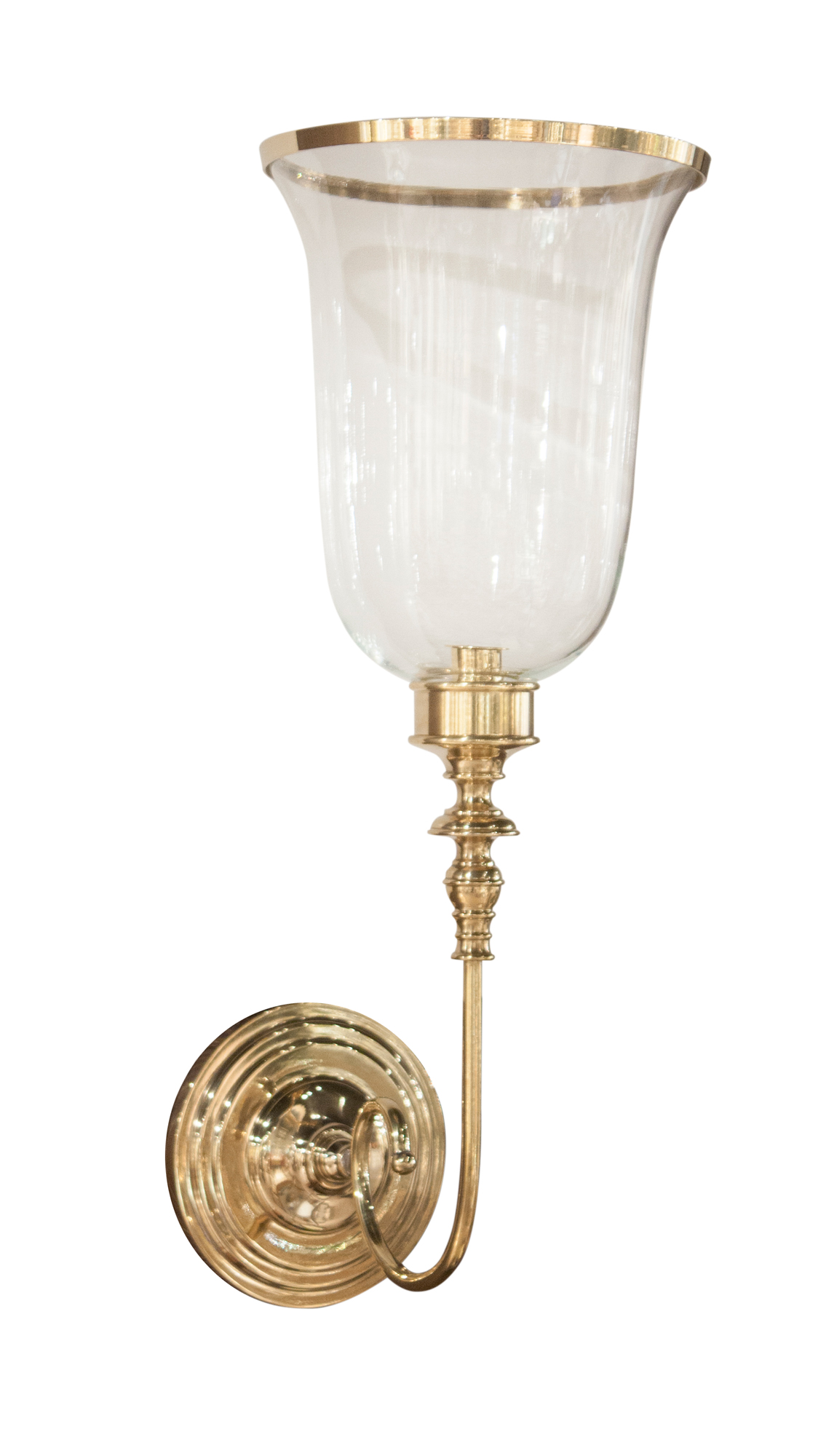 With its clear glass shade and gracefully curved arm, this lovely Brass Loop Wall Sconce will add an air of sophistication to your home. Use two to elegantly frame a mirror, or place wherever you would like to add a beautiful eye catching decorative element. Measures 10.5 inches long x 8.25 inches wide x 22 inches high.