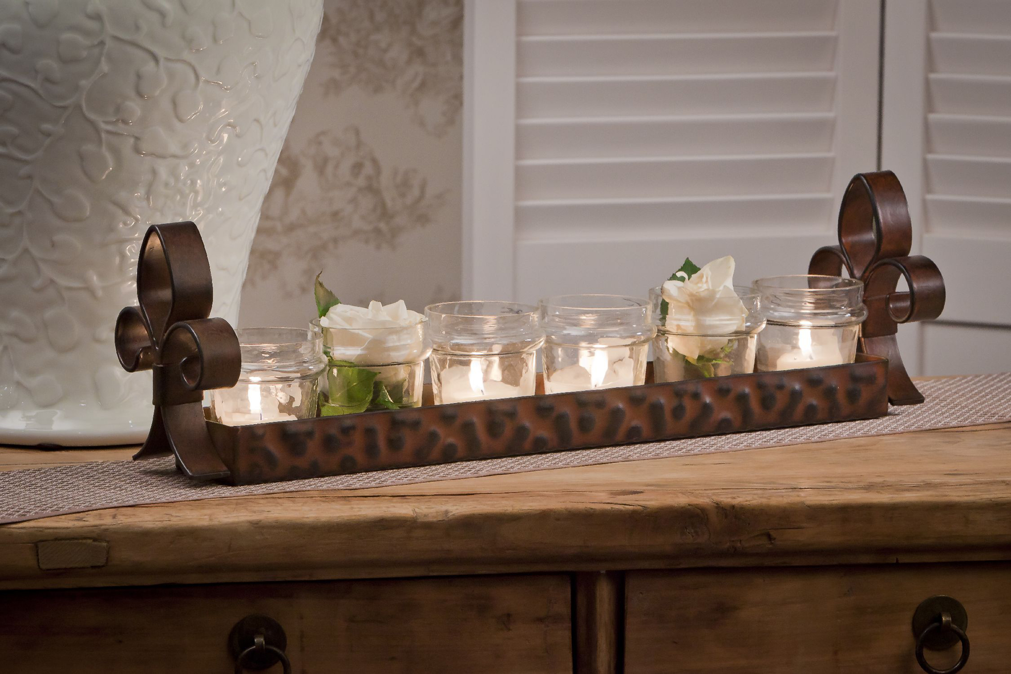 Create a warm, inviting atmosphere in your home with this beautiful Bronze Fleur De Lis 6 Votive Tray. Looks fabulous as a centerpiece on a dining table, or placed on a coffee table, side table or buffet. Holds 6 votive candles. Candles not included. Measures 19 inches wide x 4.5 inches long x 5.5 inches high.