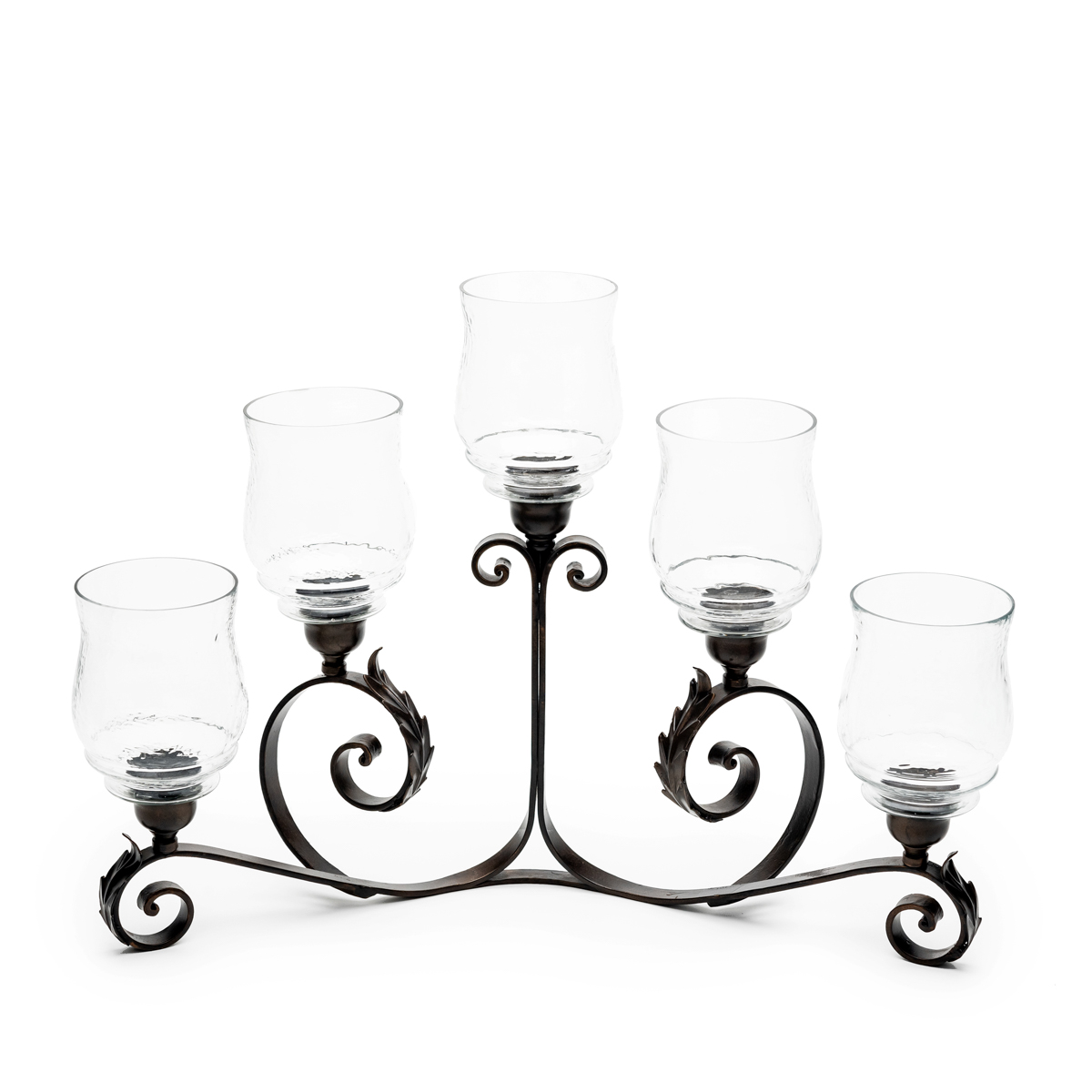 This lovely 5 light candelabra will add a tasteful, yet cozy ambiance to your home. Looks fabulous as a table centerpiece, on a mantel, or anywhere you would like to add a beautiful design element. Measures 19 inches high x 25 inches wide x 6 inches deep. Holds five 2" pillar candles.