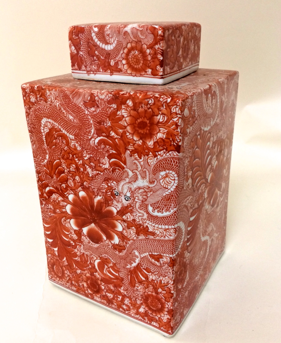 Beautiful food-safe porcelain Cinnabar Square Tea Jar with lid will be a fabulous addition to your kitchen countertop, curio cabinet, or tabletop. Makes a stylish way to store your favorite teas. Lovely, timeless pattern also looks great displayed empty on a shelf. Measures 8.5 inches x 8.5 inches x 15 inches high.