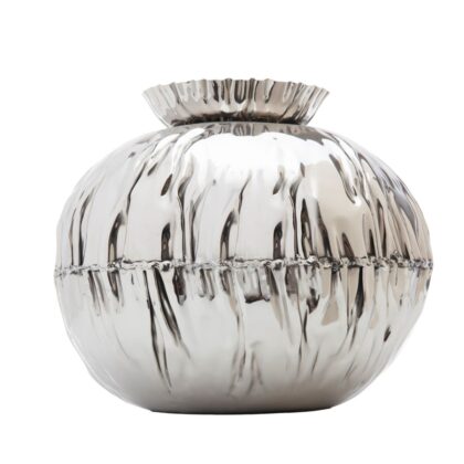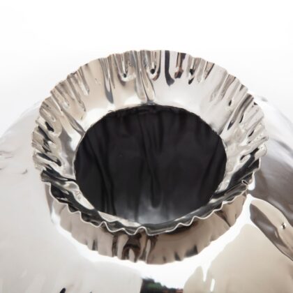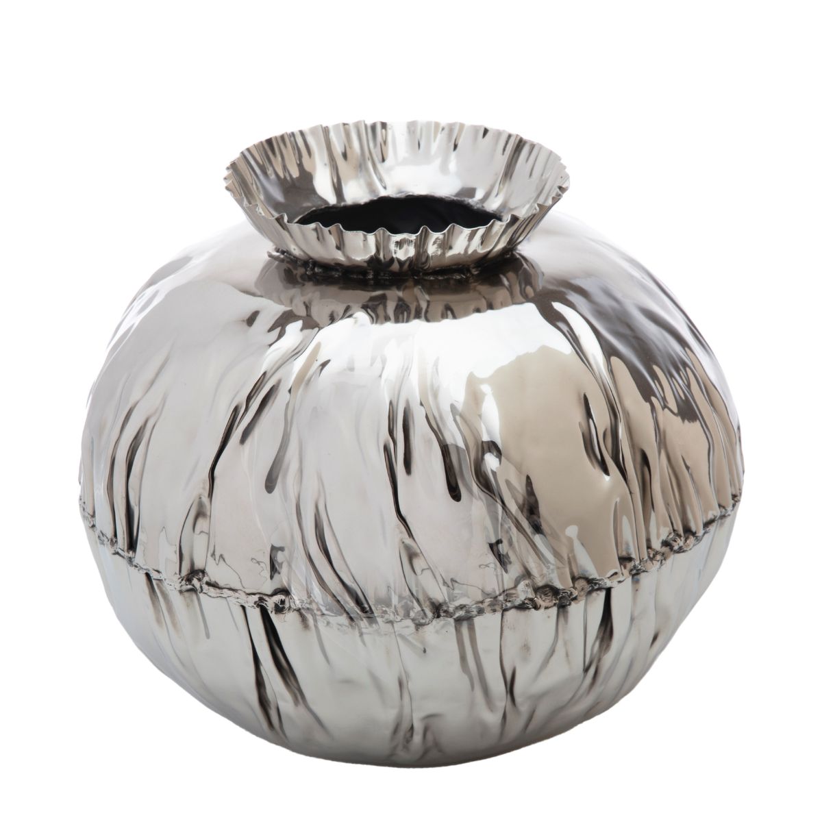 Exuding an air of modern elegance, this beautiful crumpled edge round stainless steel vase makes a dramatic, eye-catching presentation on a table or sideboard filled with flowers, and is also fabulous displayed empty as a work of art. Measures 10.5 inches high x 11 inches in diameter.
