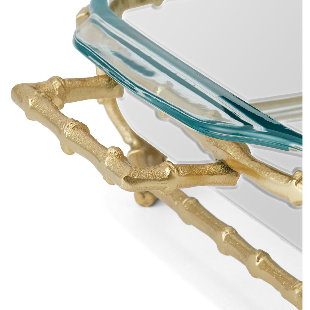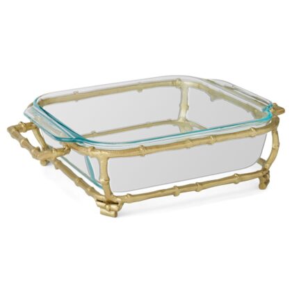 Show off your culinary creations with an elegant flair when you place them before your guests in this beautiful Asian-inspired gold color Bamboo-Look Square Pyrex Holder. This piece makes an exquisite presentation on your dining table, buffet or countertop. Includes glass baking dish. Pyrex dish made in the U.S.; holder made in India. Glass dish only is dishwasher safe; metal holder can be wiped clean with damp cloth. Pyrex dish is oven safe to 450 F. Measures: 11.5 inches long x 9.25 inches wide x 3 inches high.