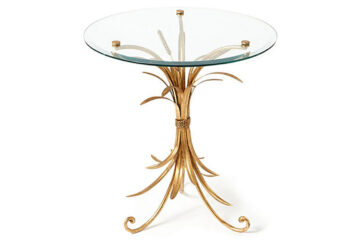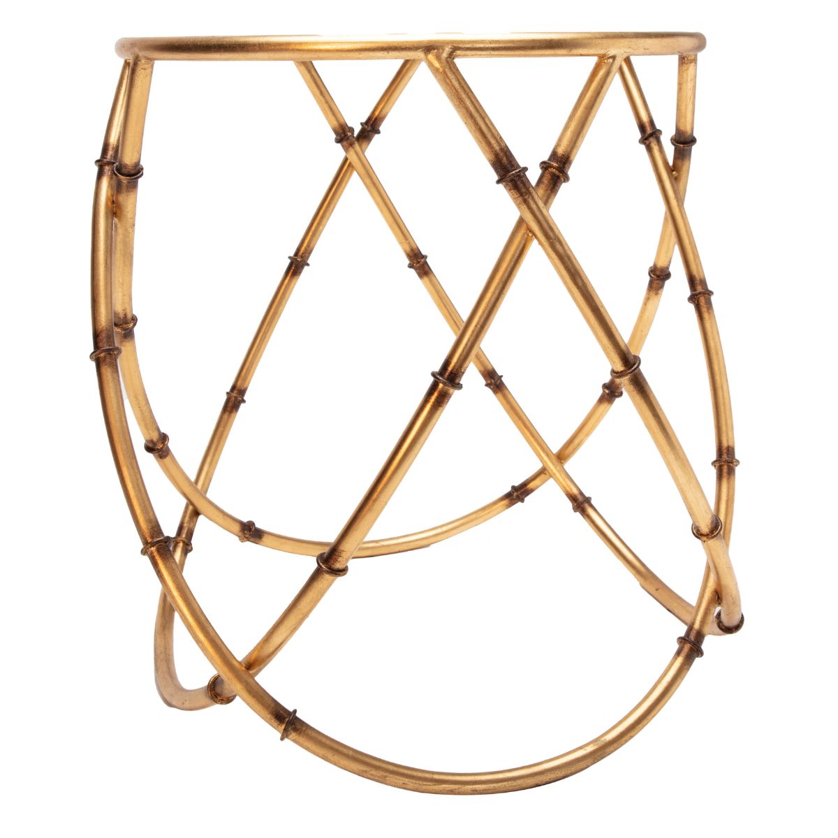 This beautiful side table with lovely antique gold color bamboo-style frame and clear glass top is designed to make a fabulous statement wherever you place it in your home. Both decorative and functional, this gorgeous piece adds a stylish and airy element to any room. Top with a lamp, decorative jar or floral arrangement, or place your wine glass within reach next to a chair. Measures 21.5 inches in diameter x 20.5 inches high.