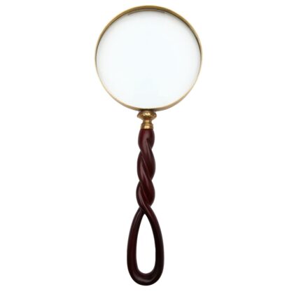 Crafted of mahogany wood-look resin and brass, this magnifying glass with its handsome twist and loop handle is a great-looking and useful decorative element when placed on your desk, bookcase or table. Makes a perfect gift. Measures 5 inches long x 5 inches wide.