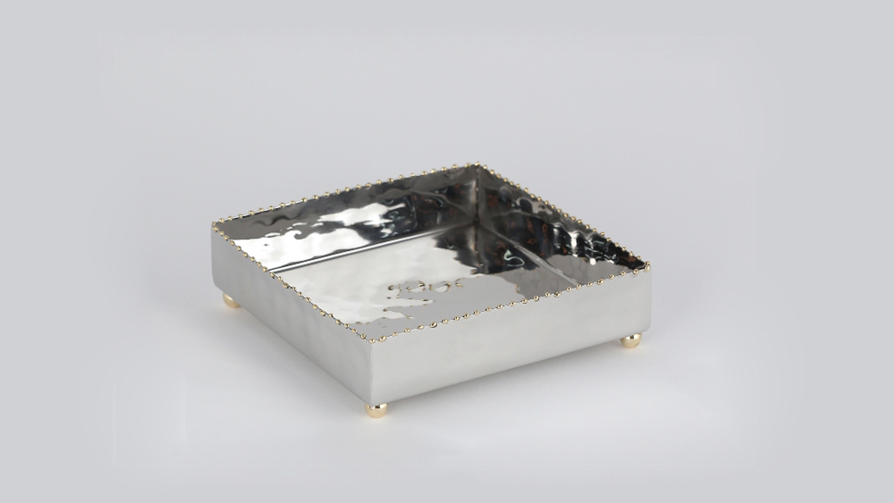 This lovely Nickel Finish Gold Bead Cocktail Napkin Holder will add a beautiful detail to your bar or table while keeping napkins within easy reach. Measures: 5 inches x 5 inches x 2 inches.