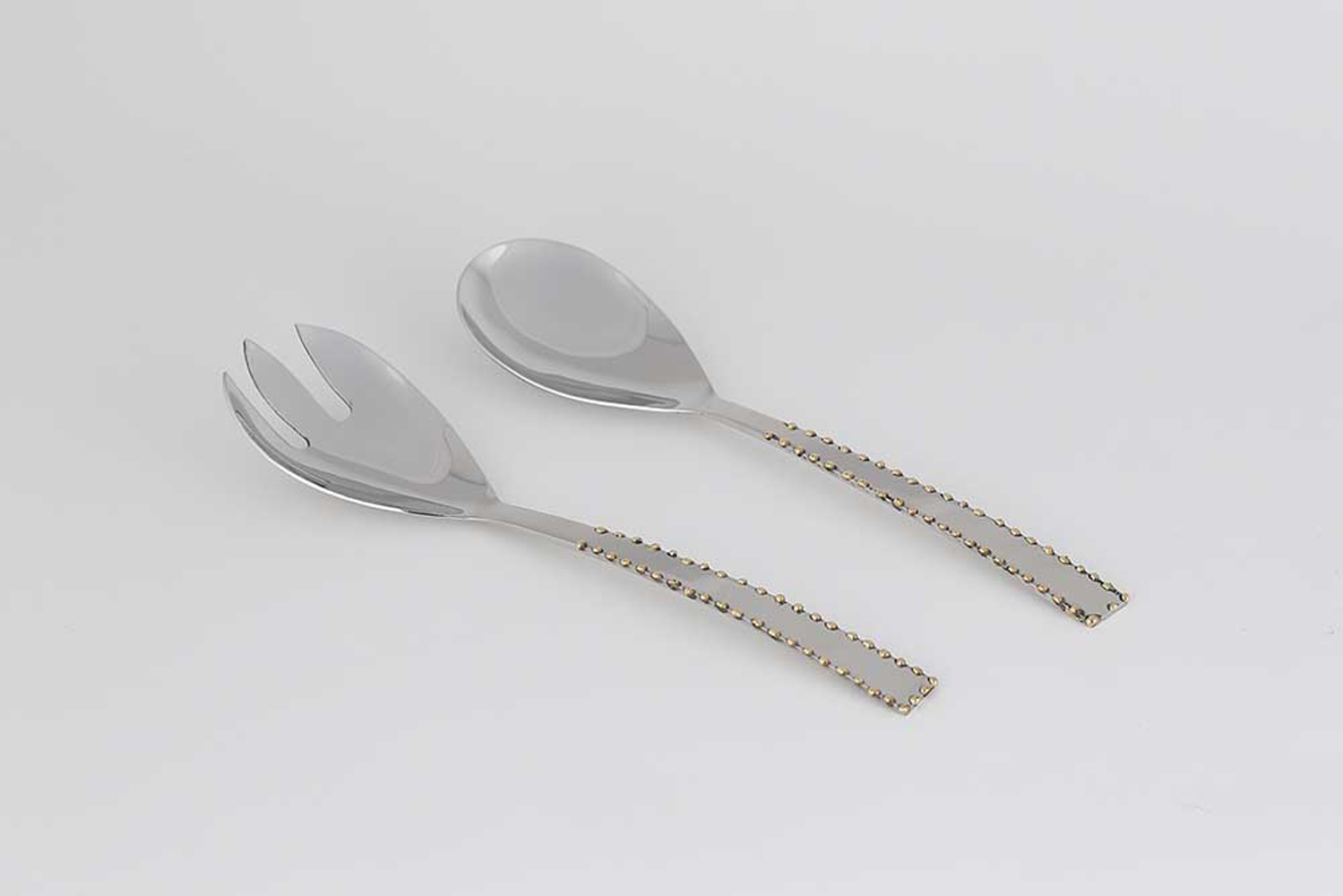 Use these lovely salad utensils with gold beaded edging to dress up your table when serving your guests. Includes serving fork and spoon. Each piece measures 11.75 inches long x 2.75 inches wide x 1.25 inches high.