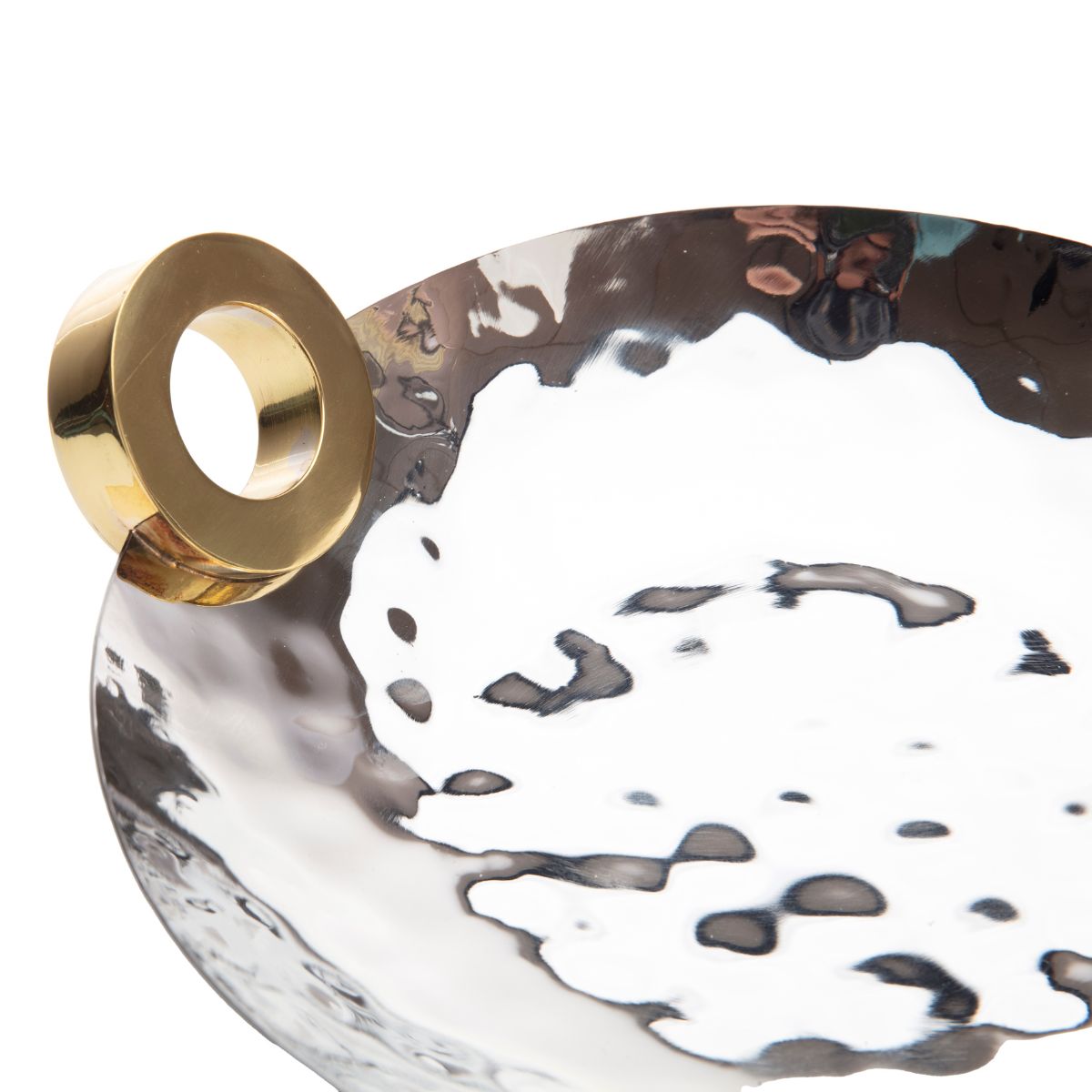 Stylish and contemporary, this beautiful stainless steel Gold Ring Centerpiece will make an elegant presentation on your dining table, buffet or coffee table. Food safe. Measures 3.5 inches high x 12 inches wide x 10 inches long.