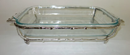 Show off your culinary creations with an elegant flair when you place them before your guests in this beautiful Asian-inspired nickel color Bamboo-Look Rectangular Pyrex Holder. Makes an exquisite presentation on your dining table, buffet or countertop. Includes glass baking dish and metal holder. Pyrex dish made in the US, holder made in India. Glass dish only is dishwasher safe; metal holder can be wiped clean with damp cloth. Pyrex dish is oven safe to 450 F. Measures 17.5 inches L x 10 inches W x 3 inches H.
