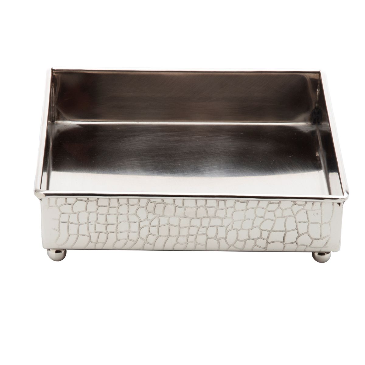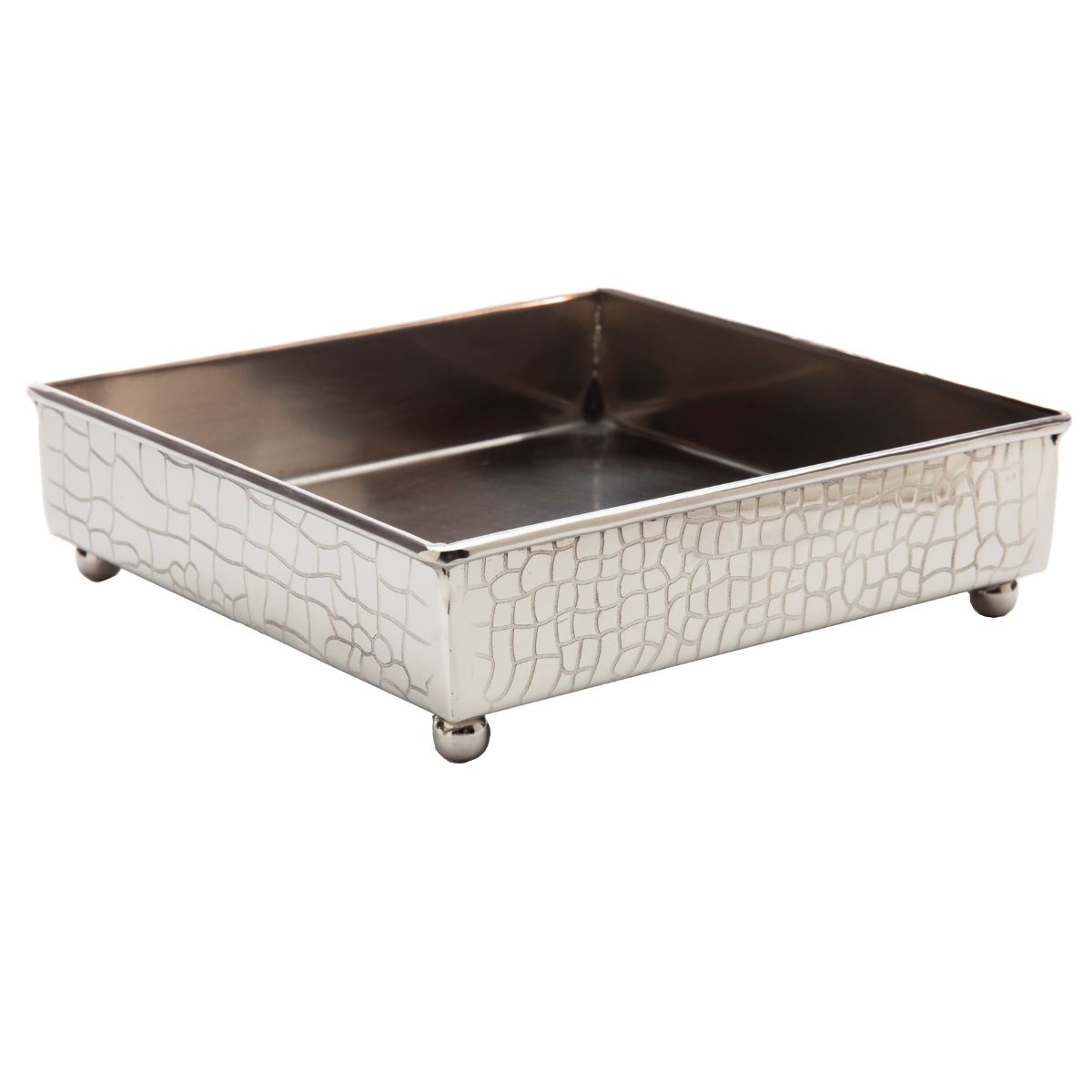This stylish Nickel Color Crock Square Lunch Napkin Tray will add a beautiful detail to your table or countertop while keeping napkins within easy reach. Measures 7.5 inches long x 7.5 inches deep x 2 inches high.
