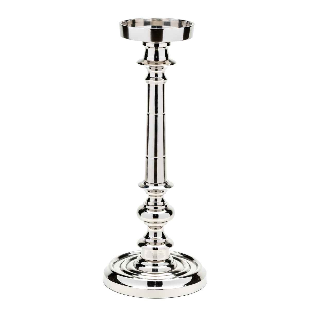 Add a lovely design element to your decor with this beautiful Nickel Finish Pillar Candleholder. Its shapely, statuesque style lends an elegant look to a buffet or sideboard. Holds a 3-inch pillar. Candle not included. Measures 8 inches wide x 8 inches deep x 20 inches high.