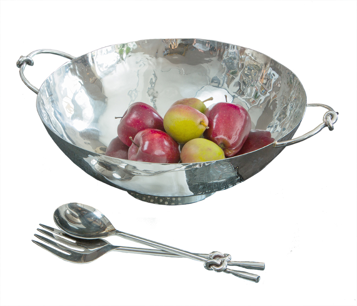 A simple knot on each handle brings an air of quiet sophistication to this lovely textured stainless steel bowl. Makes a tastefully elegant presentation on a dinner table or buffet when serving your guests, or used as a centerpiece filled with fruit. Holds 132 ounces. Measures 14 inches in diameter x 5 inches high.