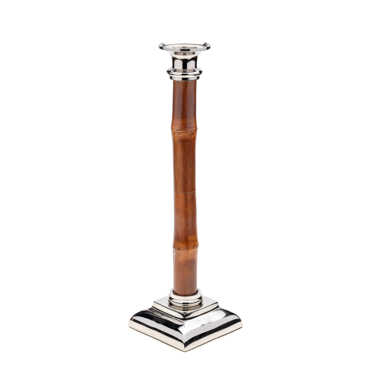 This lovely 14-inch candleholder with its beautiful warm-colored bamboo and polished nickel finish will add a refined yet cozy ambiance to your home. Use as a table centerpiece, place two on either end of a mantel, or create an elegant display using all three sizes. Measures: 3.5 inches x 3.5 inches x 14 inches.