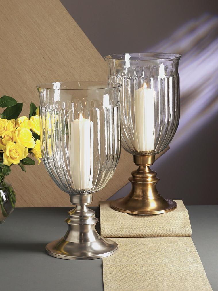 Create a warm, inviting atmosphere in your home with this elegant hurricane. With its stepped base, green tint fluted glass and beautiful pewter finish, it looks lovely on a sideboard, buffet or table. Holds a 3-inch pillar candle (candle not included). Measures 11 inches in diameter x 21.5 inches high.