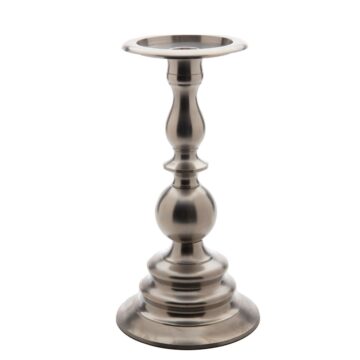 Create a warm, inviting atmosphere in your home with this elegant hurricane. With its stepped base, green tint fluted glass and beautiful pewter finish, it looks lovely on a sideboard, buffet or table. Holds a 3-inch pillar candle (candle not included). Measures 11 inches in diameter x 21.5 inches high.